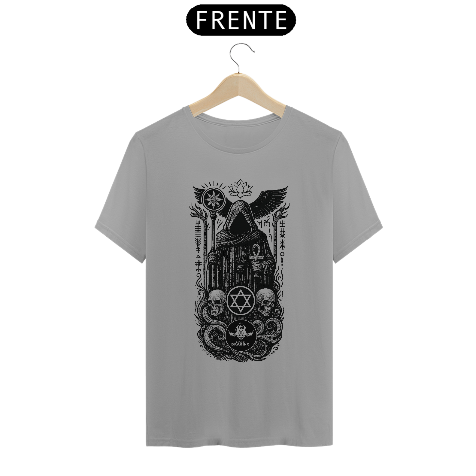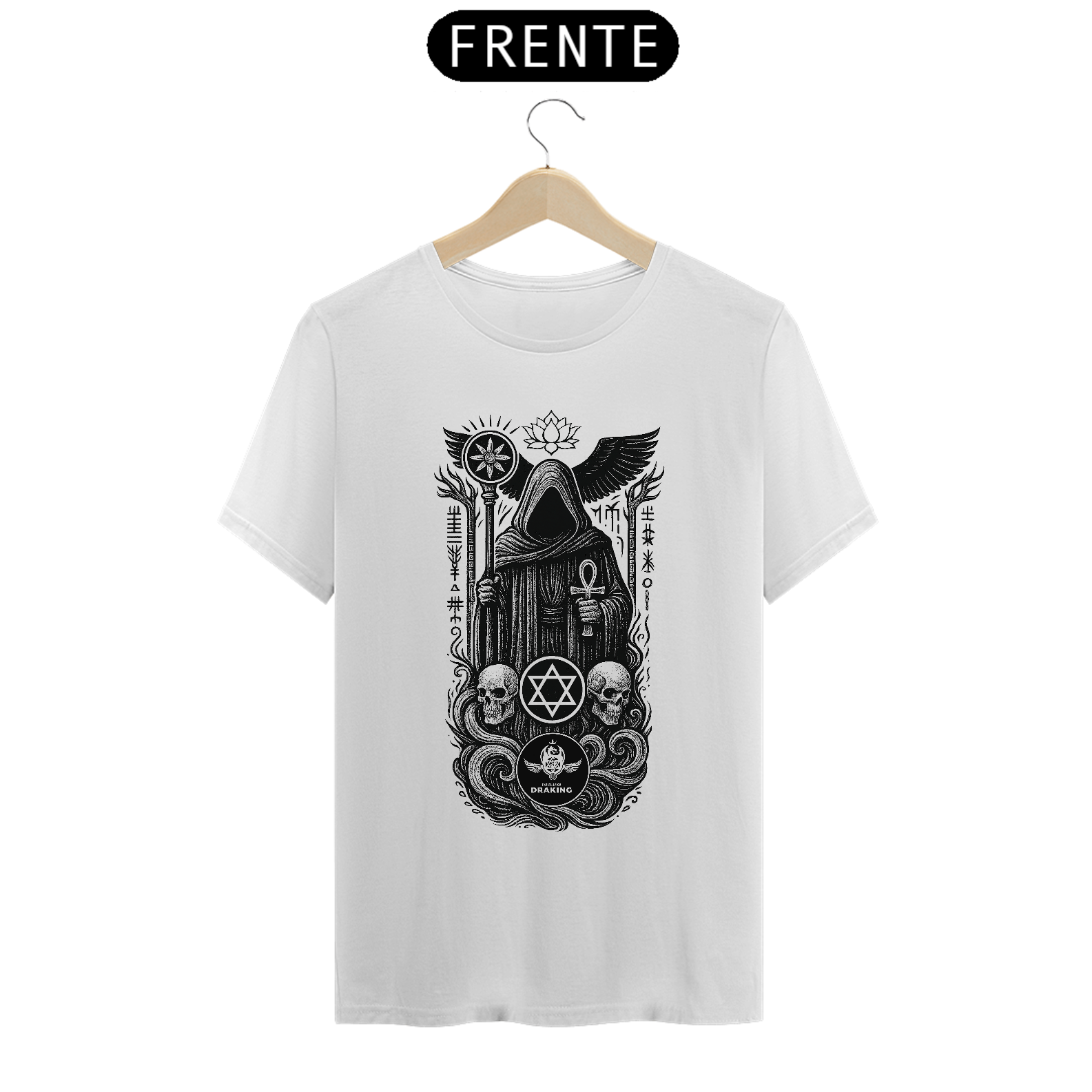 Envolva-se na força transcendental do fim e do renascimento com a Camiseta Imperial Anjo da Morte, uma peça que carrega o selo vibracional do encerramento dos ciclos e da passagem entre os mundos. Esta estampa poderosa retrata o Anjo da Morte em sua forma absoluta: imponente, silencioso, e portador de verdades que só os iniciados ousam contemplar.