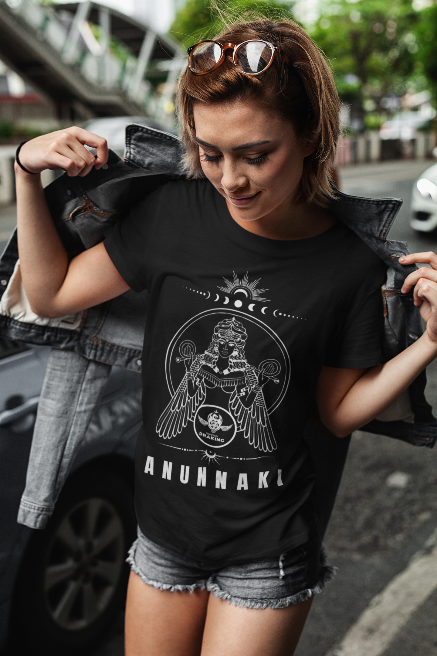 Mergulhe no mistério e na sabedoria da lua com esta camiseta exclusiva, que apresenta Nanna, a Deusa da Lua Anunnaki, segurando símbolos místicos relacionados à lua, em um gesto carregado de poder e conhecimento ancestral. A estampa única é complementada pela icônica logo imperial, criando um design fascinante que celebra a mitologia mesopotâmica.