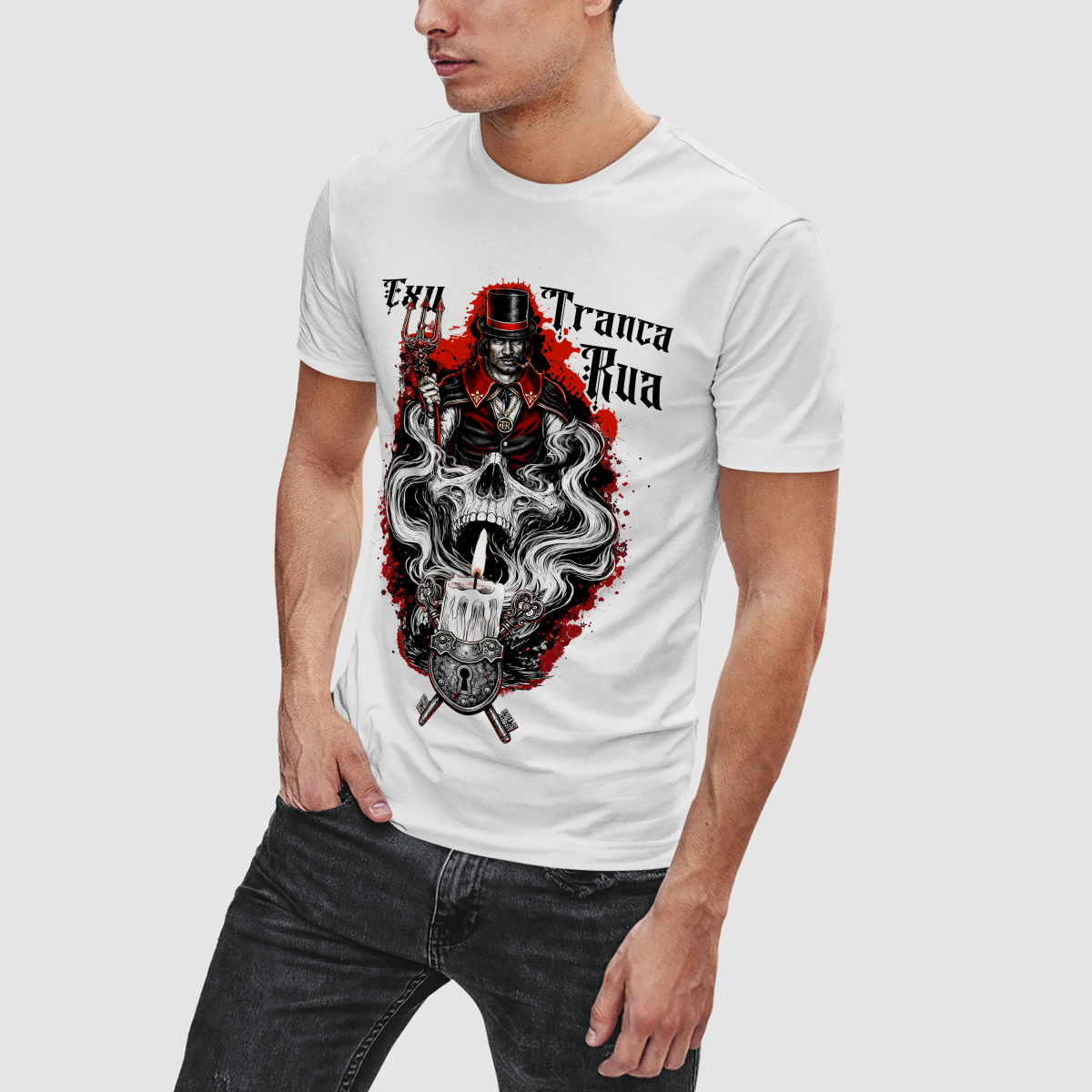 A Camiseta Tranca Rua representa o guardião das encruzilhadas, aquele que protege, direciona e mantém o equilíbrio entre os caminhos visíveis e ocultos.